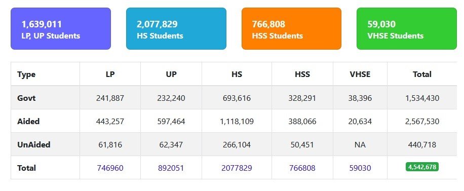 പൊതു വിദ്യാഭ്യാസ ഡയറക്ടറേറ്റിന്റെ അടിസ്ഥാനത്തില് സംസ്ഥാനത്ത് 16028 സ്കൂളുകള് ഉള്ളതില് 4542678 സ്കൂള് വിദ്യാര്ഥികളും 169373 അധ്യാപകരും 20297 അനധ്യാപകരുമാണുള്ളത്. അതായത്, 10046 LP, UP സ്കൂളുകളും, 3516 ഹൈസ്കൂളുകളും, 2077 ഹയർ സെക്കന്ററി സ്കൂളുകളും, 389 VHSE സ്കൂളുകളുമാണുള്ളത്.