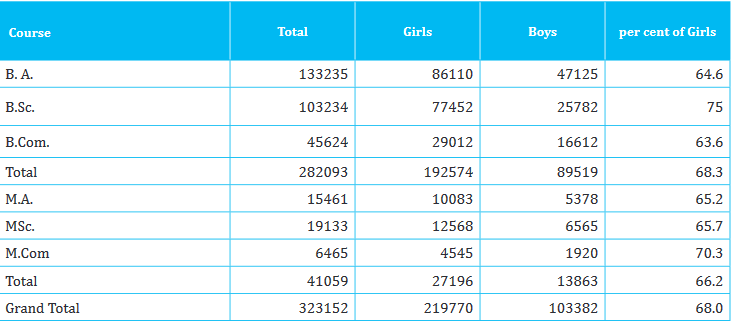 യു.ജി.സിയുടെ കണക്കില് കേരളത്തില് 30,998-ല് കൂടുതല് വിദ്യാര്ഥികളാണ് സംസ്ഥാന സര്വകലാശാലയുടെ കീഴില് പഠിക്കുന്നത്. ഇതില് ചിലതിന്റെ കണക്ക് ലഭ്യമല്ല. ആയതിനാല് സംസ്ഥാന ആസൂത്രണ ബോര്ഡിന്റെ സാമ്പത്തിക അവലോകനം 2019-ല് നിന്ന് ബോധ്യമാകുന്നത് മൊത്തത്തില് 3.28 ലക്ഷത്തോളം വിദ്യാര്ഥികള് ഉന്നതതല വിദ്യാഭ്യാസ മേഖലയിലുണ്ടെന്നാണ്.